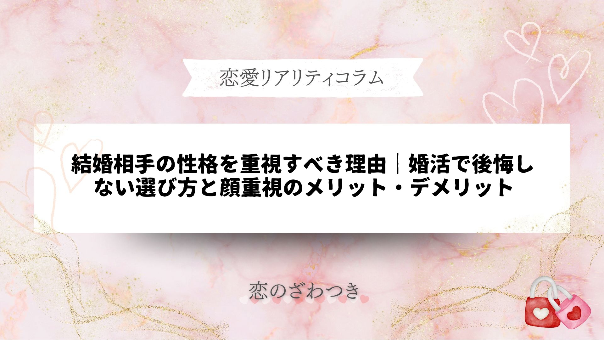 結婚相手を選ぶ際、多くの人が「性格」と「外見」のどちらを重視すべきか迷います。結婚相手の性格は、幸せな結婚生活を送る上で非常に大切な要素です。本記事では、なぜ婚活で顔より性格が重視されるのか、また性格を見極める具体的な方法や、後悔しない結婚相手選びのポイントを徹底解説します。長い人生を共に歩むパートナー選びのヒントが満載ですので、ぜひ最後までご覧ください。